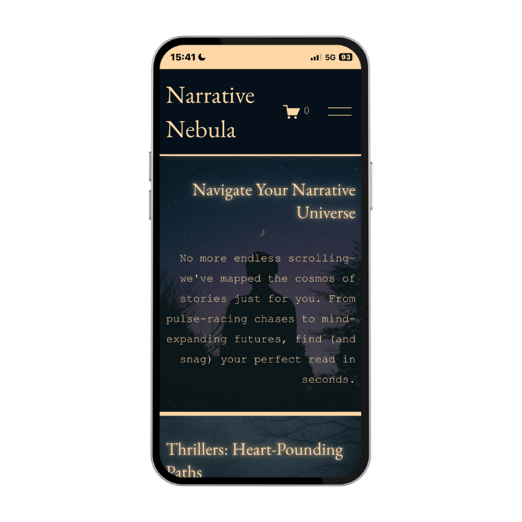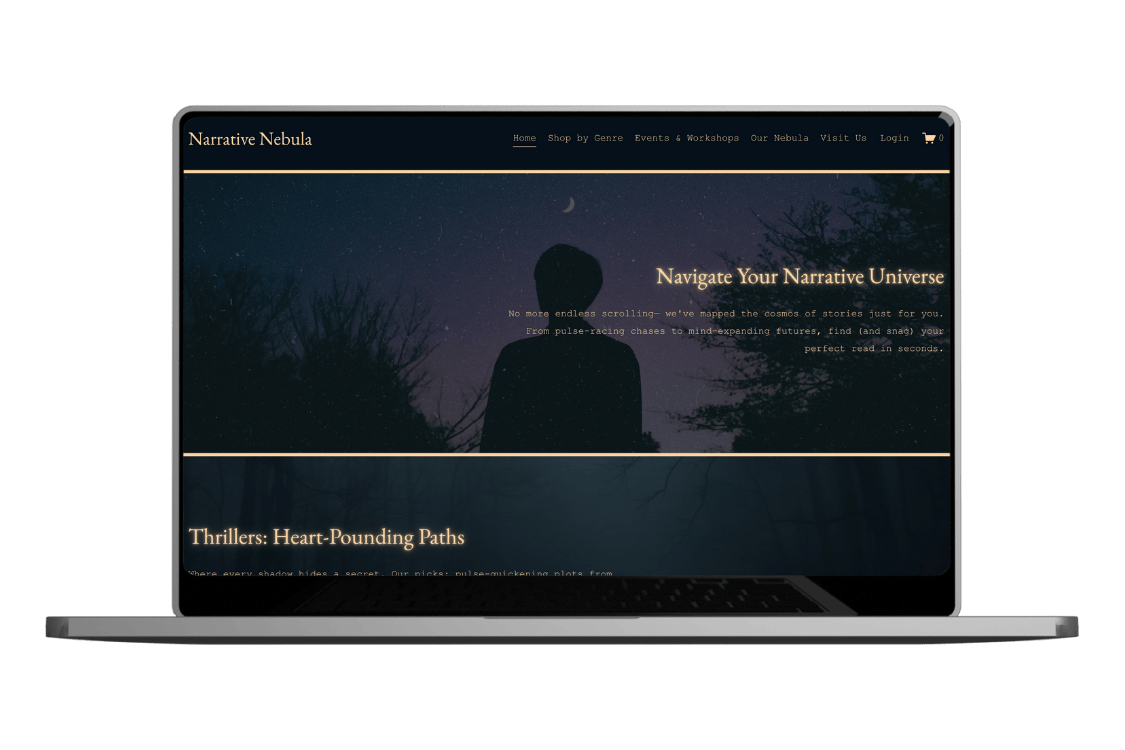 Narrative Nebula (fictional) is a modern indie bookstore built for readers who love curated recommendations, cozy spaces, and community events. The concept blends an online shop with an editorial feel—featuring genre-based collections, staff picks, and recurring experiences like book clubs and writing workshops. The site is designed to feel immersive and atmospheric while keeping the navigation clear and the CTAs action-driven (shop, join, RSVP).